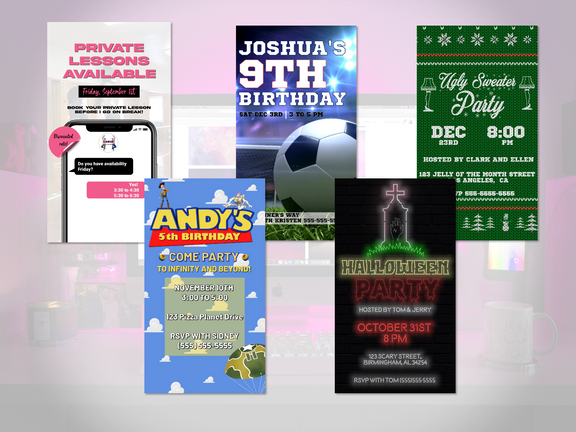 A selection of ready-to-use animated invitations and graphics for various occasions, offering a quick and stylish way to invite guests to your events.